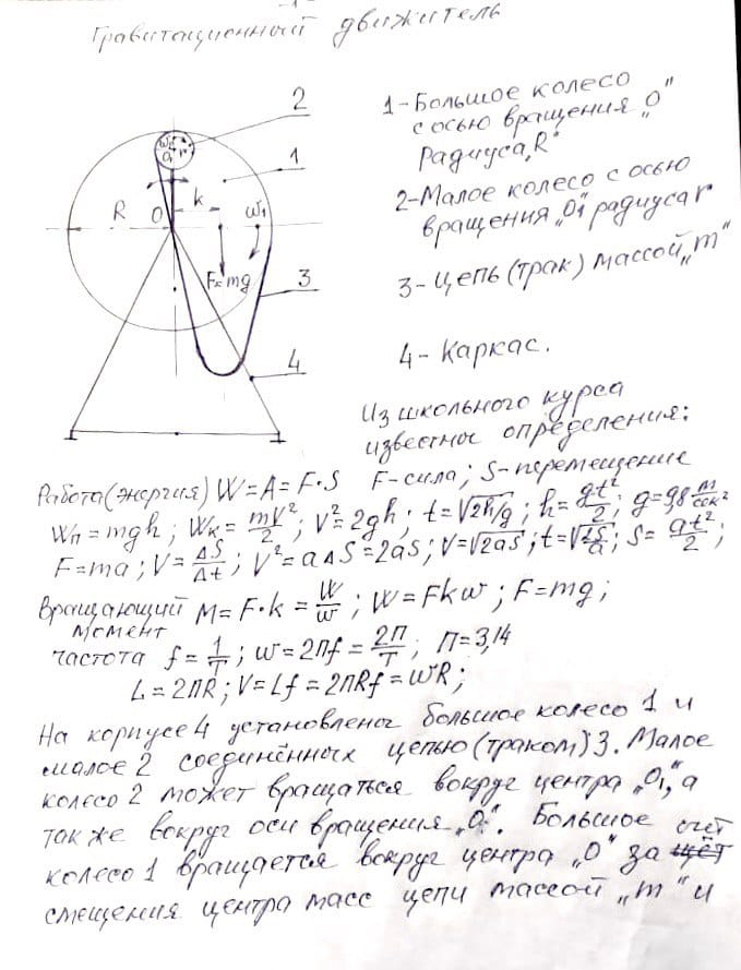 В исходном состоянии рис.2 большое колесо 1 соединено с манометром 5, которыйпоказывает значение М за счет воздействия силы F = mg, при этом w1 = 0, а цепьнаходится на большом колесе 1на участке А-В. При вращении малого колеса 2 +/- дельтапоказания манометра остаются неизменными. При вращении малого колеса 2 иперемещение его в точку 1, цепь на большом колесе находится на участке 1-А-В, аследовательно центр тяжести смещается к центру «О», а показания манометра 5уменьшаются < М /2. При вращении малого колеса 2 в точку 2, цепь на большом колесе 1занимает положение 2-1-А-В, при этом центр тяжести переходит к центру вращения «О»,а показания манометра 5 становятся М=0, следовательно оптимальным режимомдвижителя является обеспечение вращения малого колеса 2 в диапазоне +/- дельта, итаким образом, чтобы выполнялось условие: w2=R/r w1, при этом+/- дельта ~ 0